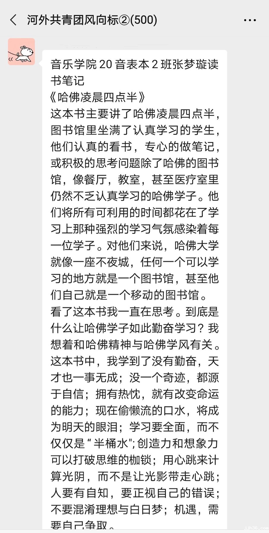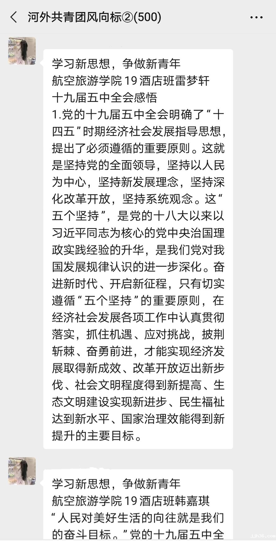 青年之于社会,犹新鲜活泼细胞之在身。作为共青团员的我们不仅要明白肩上的责任,更要在这个特殊时期精进奋斗,与国家同舟共济,共度难关!“学习新思想,争做新青年”这句话不仅仅是口号,作为河外学子,我们要秉承着“专注、坚持、征服”的河外精神奋勇前行,生命不息,学习不止!愿我们今后的日子,似锦旗,如号角,昭示成功。未来将见证着我们用坚持赢得新的“希望”!展望前方,一路辉煌。